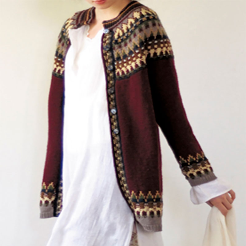 [ボーヒュース]腰が隠れる程のロング丈のカーディガン。かつての伝統ニットと比較すると、シルエットはややタイトになっています。丸ヨーク、袖口、裾の柄の配分が絶妙のバランス。