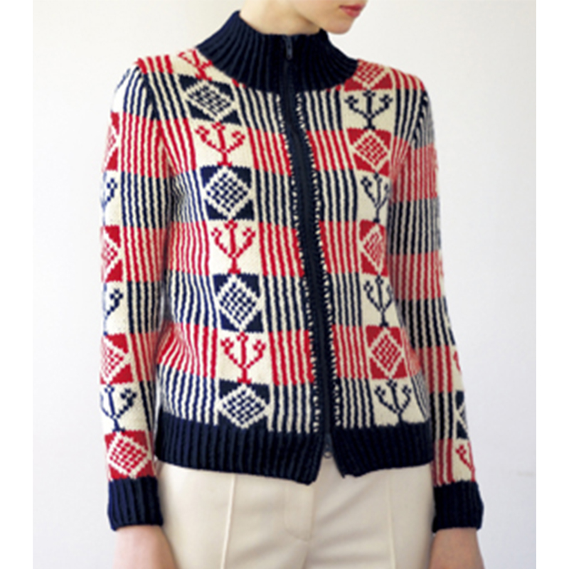 スウェーデンに伝わってきたパターンをちょっと太めの糸で編み込んでみる。「トリコロールって、新鮮!」そう思わせてくれる3色使いのニットジャケット。オープン・ファスナーがいいでしょ?