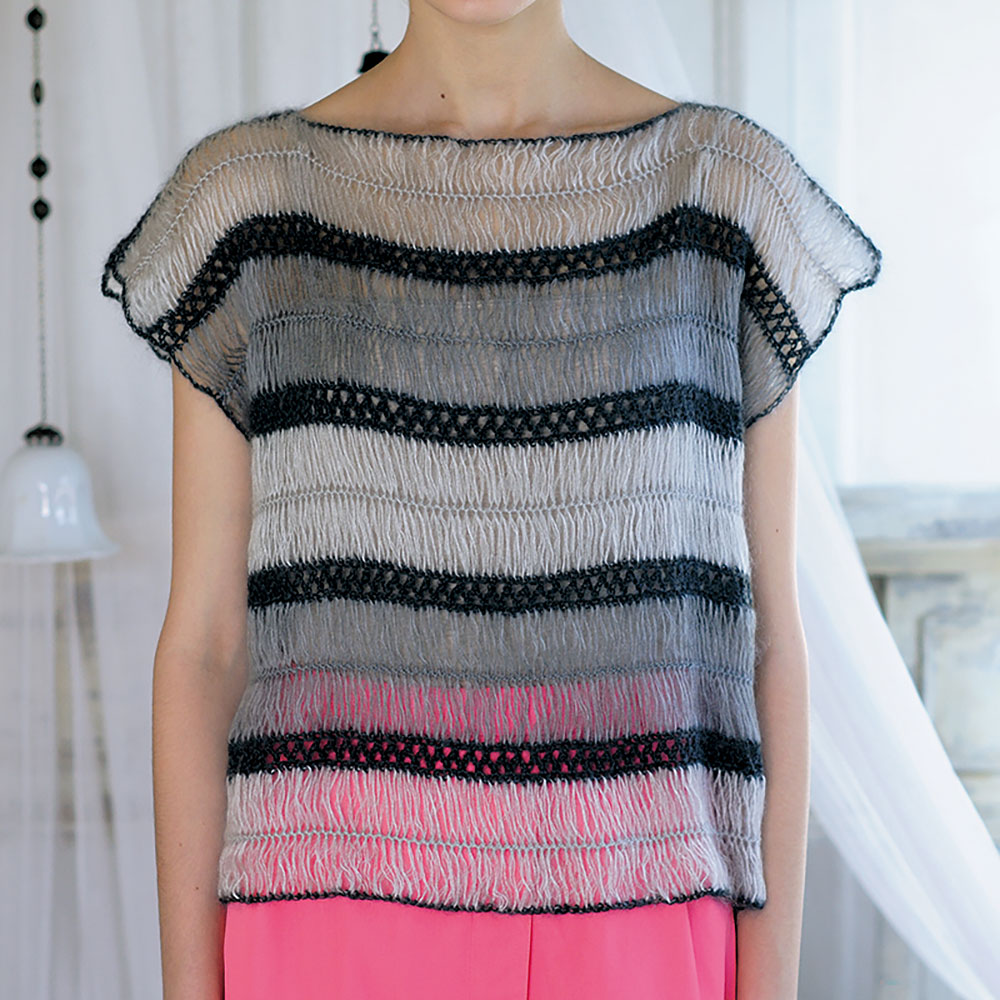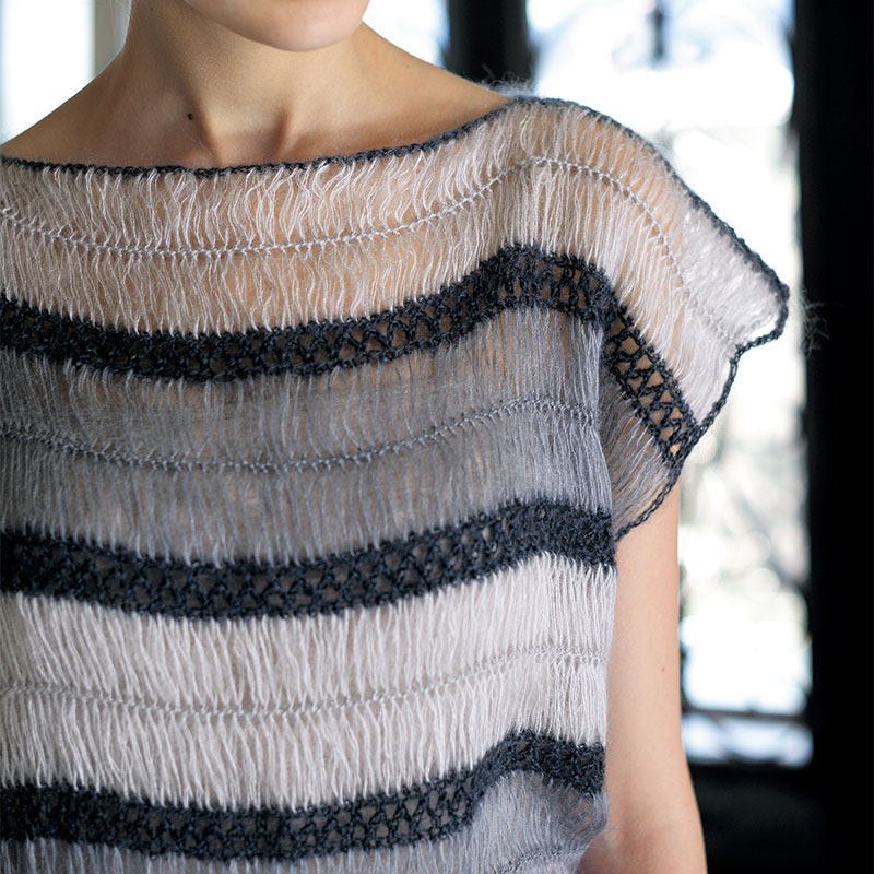ブレードをまっすぐなままボーダーにつないだベストは、初めてのヘアピンレースにぴったりです。基本のブレードを作ったら、引き抜きでループを止め、鎖と細編みでブレードをつないで、できあがり。シンプルな編み地だから、ヘアピンレースならではのループの美しさと、モヘアの繊細な透け感と柔らかさが堪能できます。