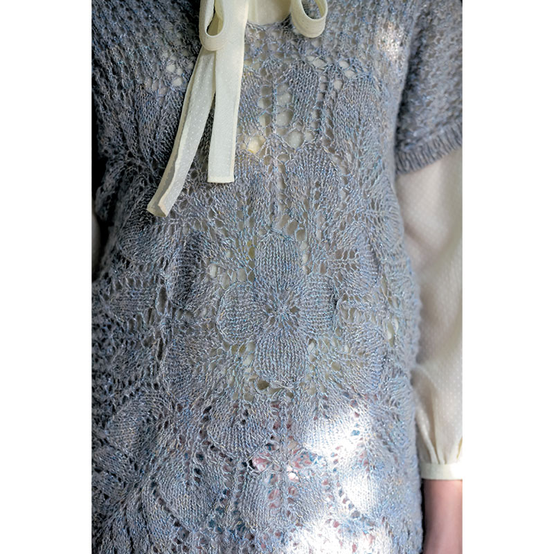 複雑な模様図に慣れて来たら、いつかは大作に挑戦したいもの。大きなレース部分さえ頑張って編めれば、残りのパーツは面倒のない、まっすぐニットの作りになっています。シルバーラメがクラシカルに煌めく、大輪のクンストレースの華が編めたら、もう怖いものなしですね。