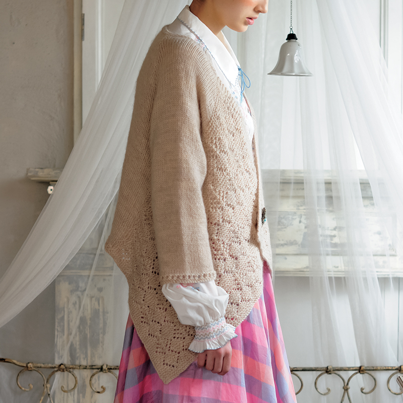 極細のシェットランドヤーンで編まれた、緻密で繊細な透け感が魅力のシェットランドレースですが、難易度が高いものは、なかなか使う気になれないもの。適度な太さの糸で編む易しい模様&レース部分はまっすぐ編めるこのジャケットなら、デイリーに活躍してくれそう。後身頃は安心のメリヤス編みです。