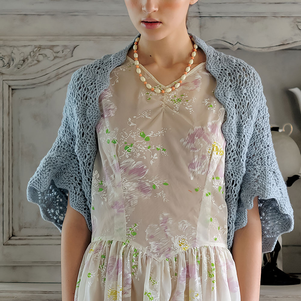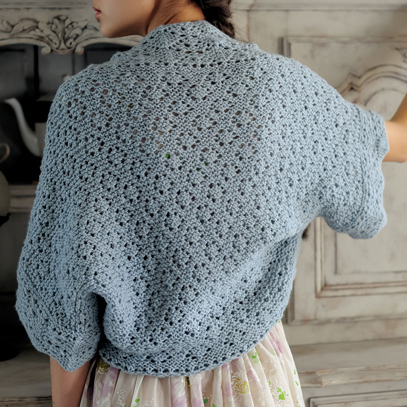 すっかり、この季節の定番アイテムの仲間入りをしたマーガレット。身頃は、規則正しくかけ目が並ぶリーフ模様、オールド・スパニッシュレースのスカラップで衿・前立てと袖口を縁取ります。ガーター編みにまっすぐシルエット、そして太めの糸と、レース編みビギナーさんに嬉しい要素がいっぱいです。