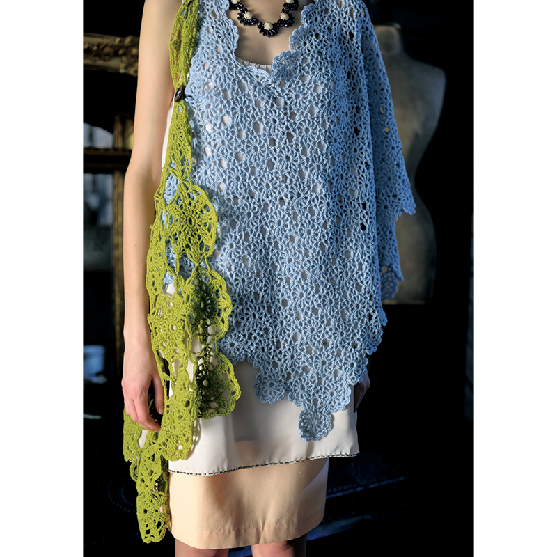 長方形の編み地にモチーフをつながない箇所をつくり、腕を出したり、頭を出したり。配色もモチーフも、編み地もふたつのベストは、ボタンでとめて2 枚の編み地を合わせれば、いろいろに着こなせます。もちろん、お好きな方の1枚をショールとして使っても。小モチーフは2段、大モチーフは5段編めば完成です。