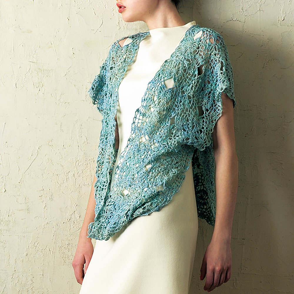 モチーフつなぎ七変化。後ろは横4 枚でつなぎ、途中から2 枚に分けて、最後は輪にします。脇をボタンでとめれば、ドレープがきれいなベストのできあがりです。