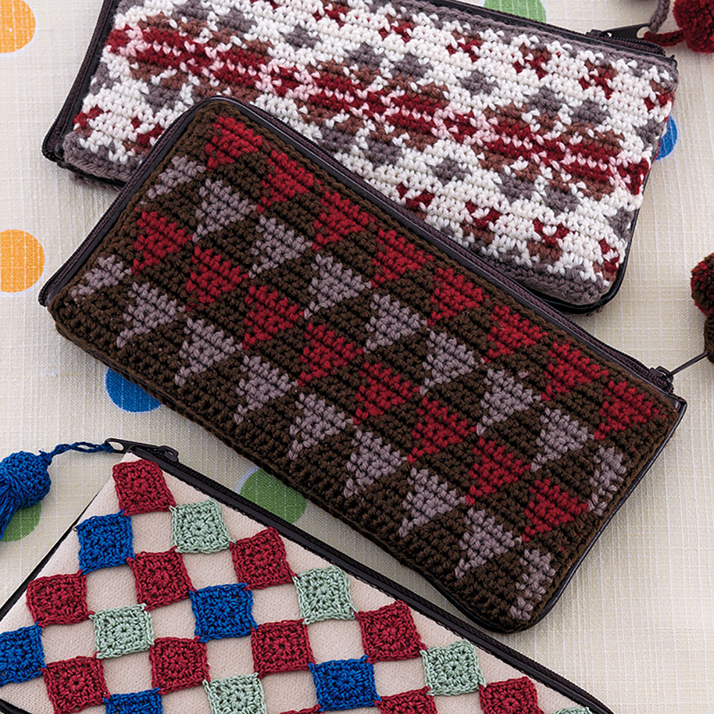 材料:パピー プリンセスアニー こげ茶(530)・グレー(529)・赤(532)各適宜。KAWAGUCHI ウォレット(13-294)各1個。