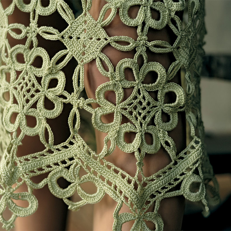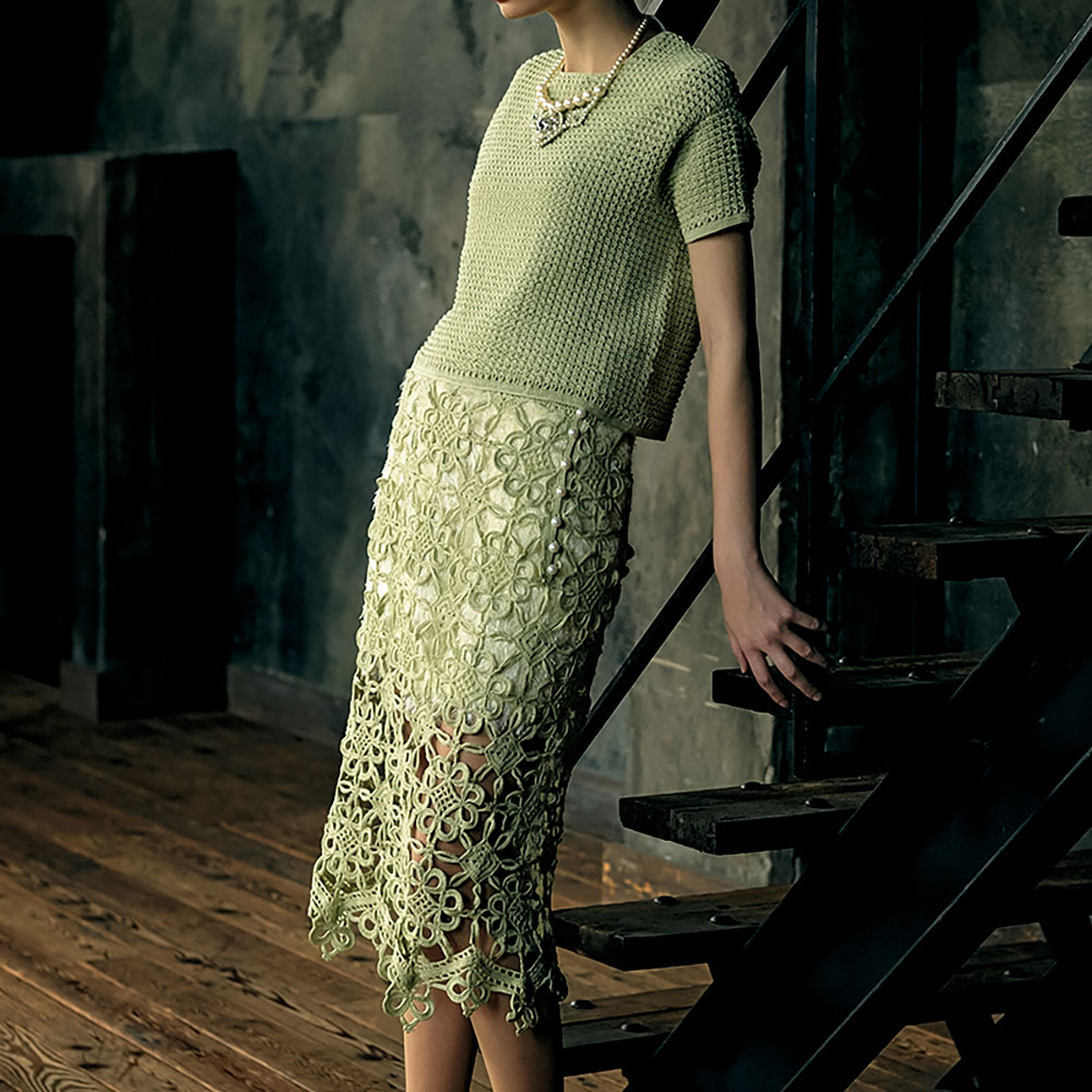 50 年前、いわゆるプルオーバーは、当時の言い方をすると「レースのブラウス」。透け感のあるモチーフはあえてスカートにして、現代風に。淡い若草色が、春の訪れを予感させます。