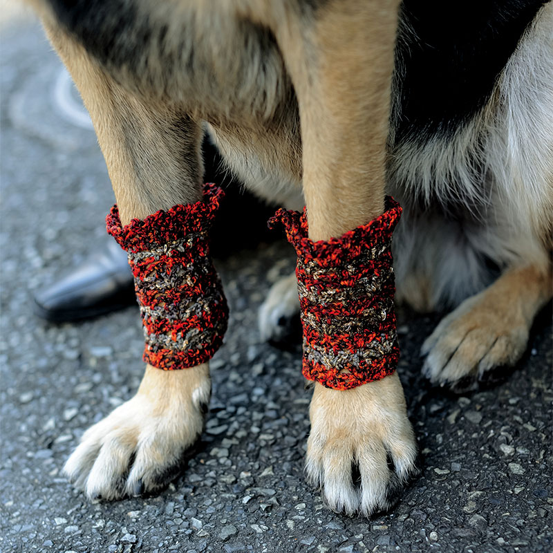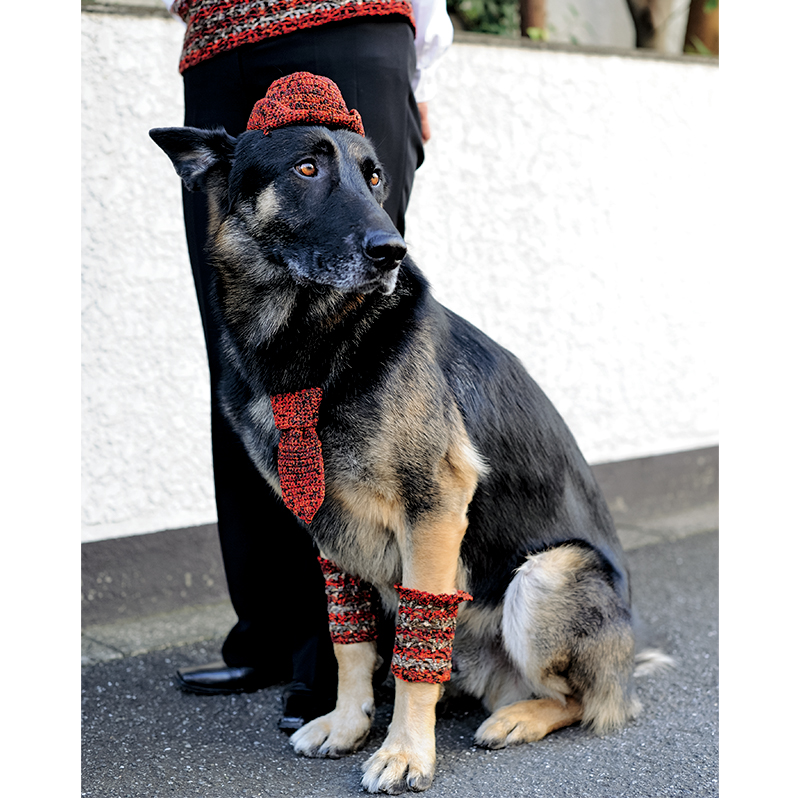 ブリムのついた帽子とネクタイ、落ちてこないように細めに編んだレッグウォーマーの3点セット。わんこの粋な装いです。