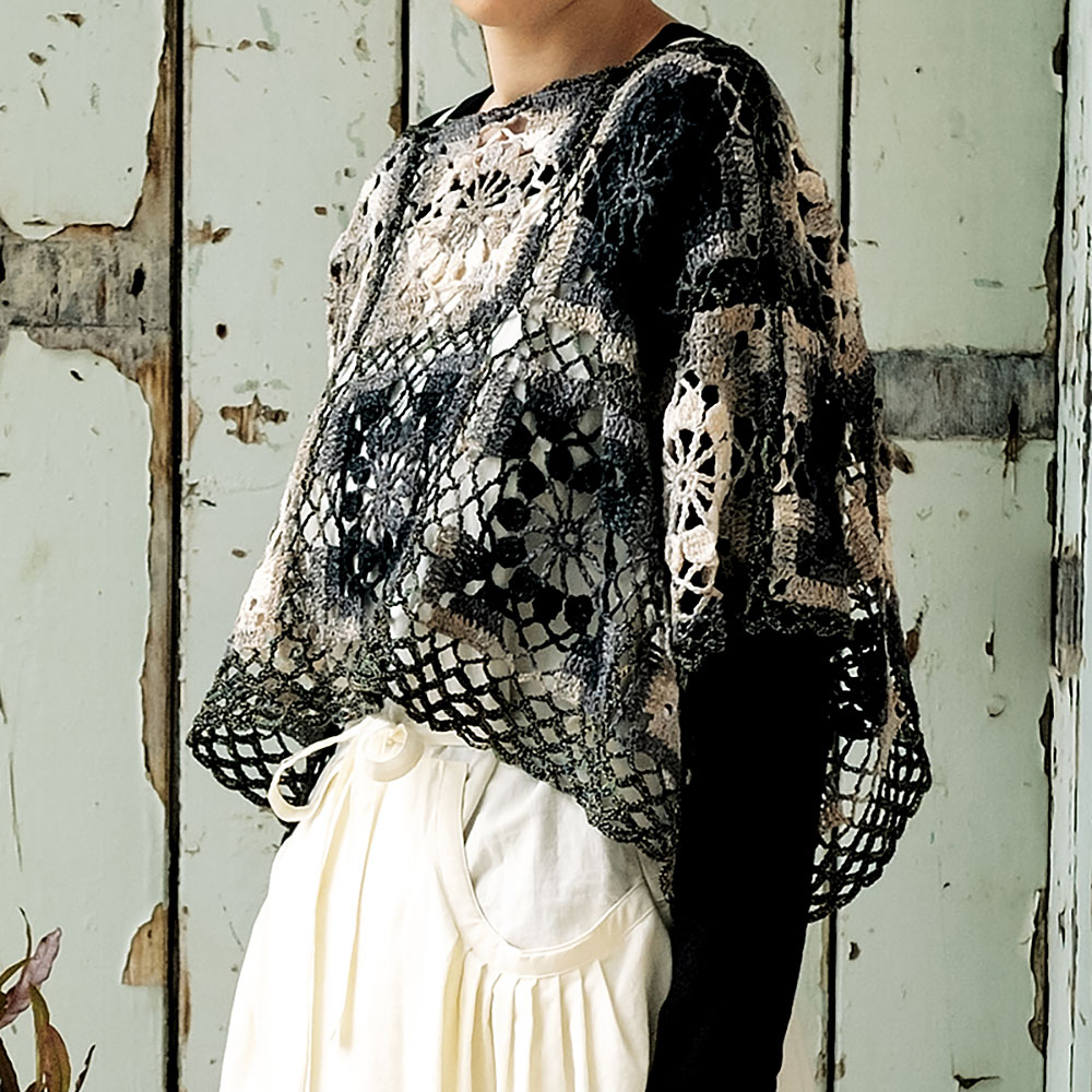 四角いモチーフをまっすぐ並べて、つないだポンチョ。段染め糸ならではのグラデーションのモチーフが、趣のある複雑なモノトーンに魅せてくれます。縁編みは黒で全体をまとめました。
