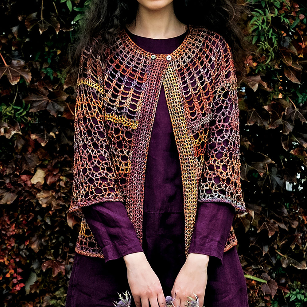 ヨーク部分の縦柄と車輪のような透かし柄の対称的な組合せが新鮮なデザイン。初めて出会う模様の記号図を確かめるとき、謎解きみたいでワクワクします。どんな風に編むのかな?