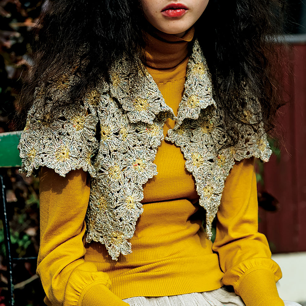 折り返ったモチーフ部分が可愛い衿に。六弁の花モチーフをつないだショート丈のボレロは、肩の角のモチーフだけを5 弁に編むことで、きれいな肩下りのラインを作っています。