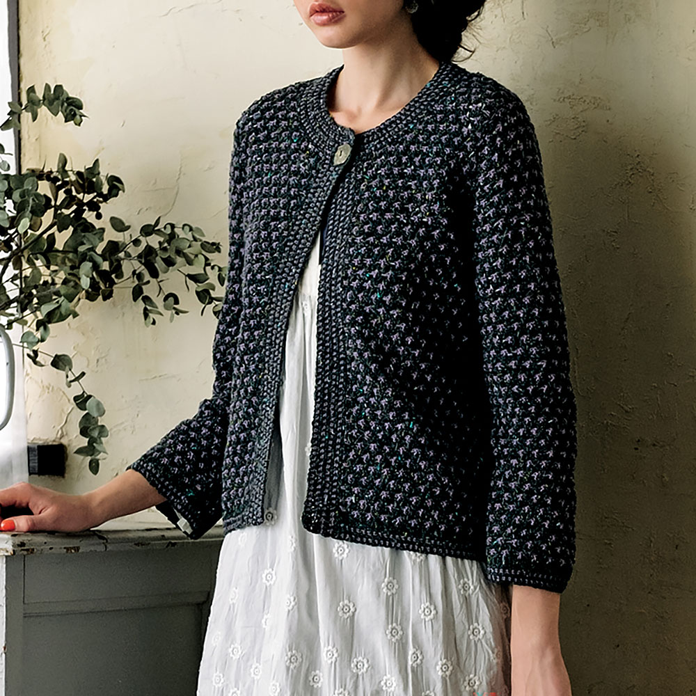 しっかりとした織り物のような編み地をジャケットに。ファンシーヤーンを松編みで編み、ストレートヤーンの細編みと引き上げ編みでスミレの花を咲かせたような模様です。