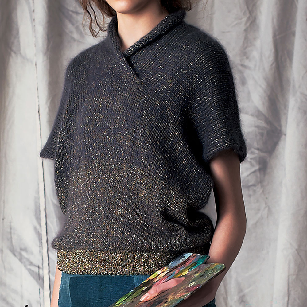 上質キッドモヘヤとラメとのコラボが、ふんわりとしたなかにも引き締まった表情を見せてくれるプル。わにして針と糸の組み合わせを替え、編み進めるうち、ゴージャスなラメのグラデが完成。