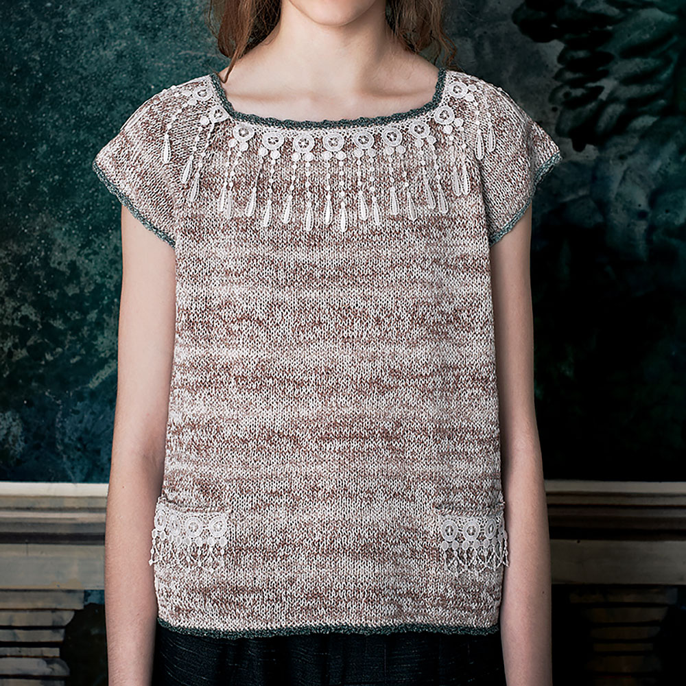 ラグランスリーブのシンプルなラメ混段染めプルには、揺れるレースを。部分カットできるフリンジレースなら、レースから目を拾い、編み地と一緒に編むだけで、軽やかに華やぎます。
