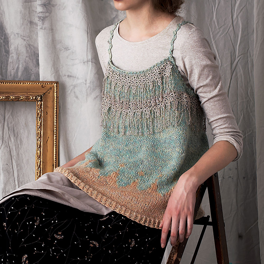 春先に欠かせない重ね着として、タンクトップはおすすめ。ラメ混の上質へアリーモヘアを綺麗色に仕上げて、胸元2 段のフリンジレースでお洒落度をアップ。肩ひもは後ろで調節可能。