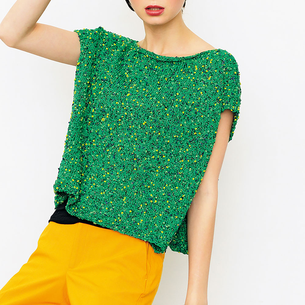 材料:リッチモア ファインパナシェ 緑(67)155g/4玉。トッピングモール 黒に緑と黄と紺のミックス(159)105g/5玉。直径18㎜のボタン2個。