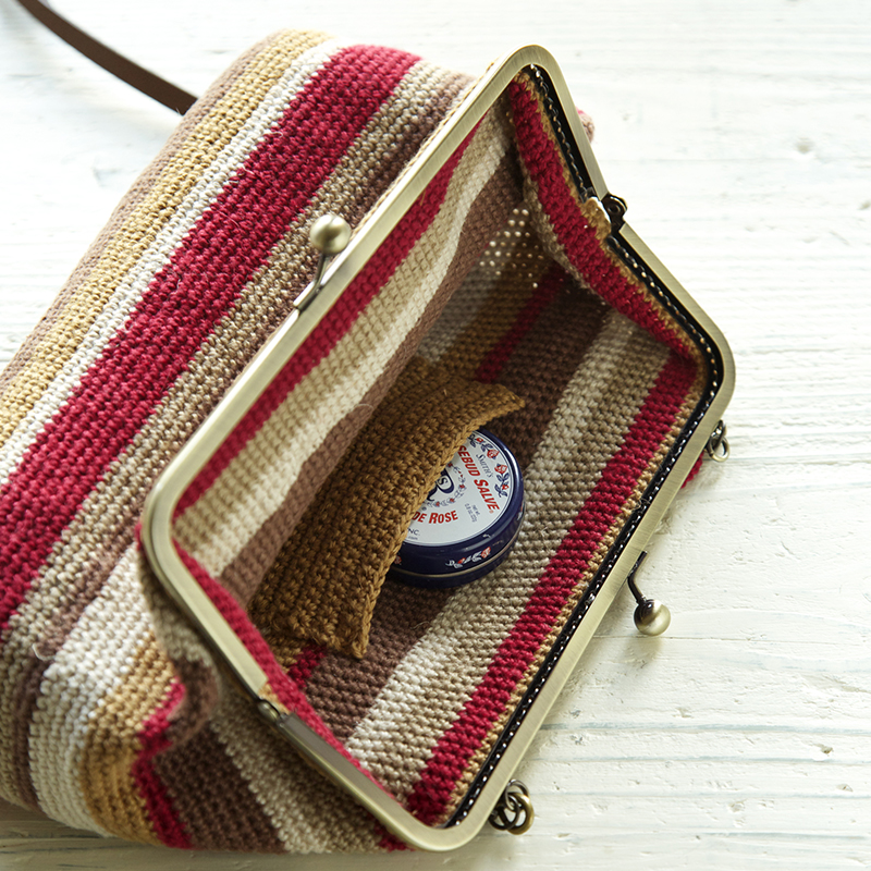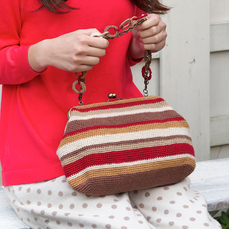 おでかけ気分がぐっとアップするランダムなボーダー柄のハンドバッグ。目の詰まった細編みなので、内袋なしで使えます。リング飾りは取り外してアクセサリーにも。