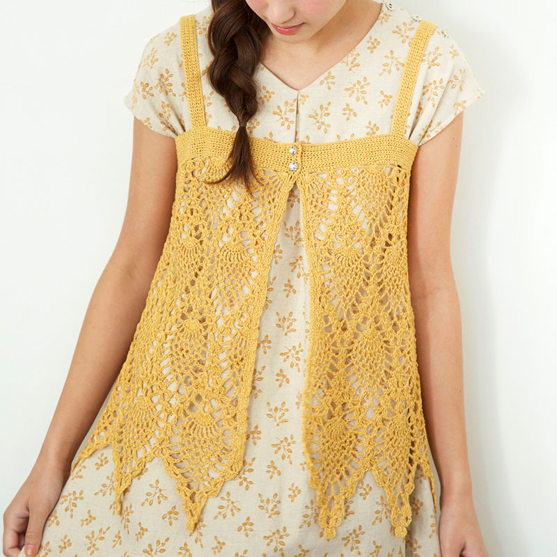 大きなパイナップル模様が印象的なキャミソール。ひらひらしたぺプラム調の裾が軽やか動きを添えてくれます。余り糸で作ったコサージュをポイントにしても。