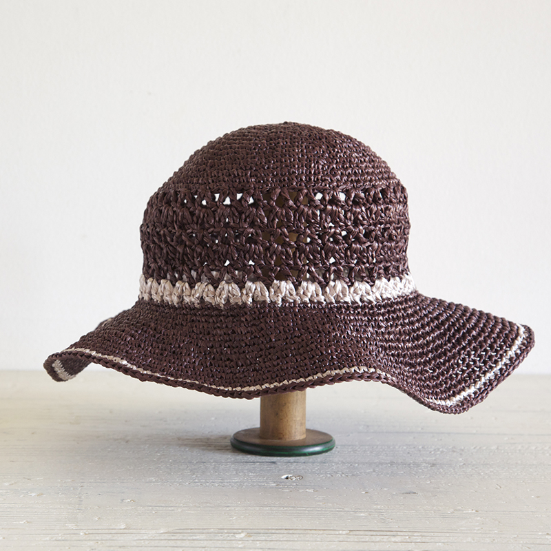 女性らしいドレープを残しつつ、軽さを出すため、ブリムの段数を少なめにしました。サイドにブライトカラーのラインを効かせたシンプルで大人っぽい仕上がりです。
