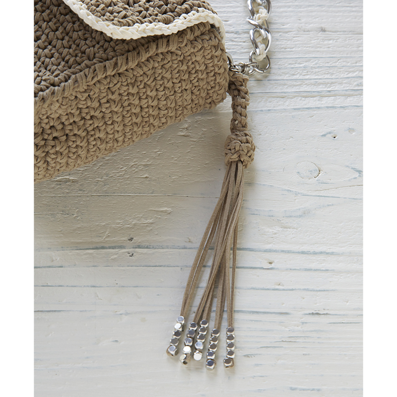 肩ひものチェーンの着脱で2Wayに使えるおしゃれなバッグ。スエード風の糸で高級感を出しました。ベースは細編み、ふただけが模様編みだからとっても簡単。