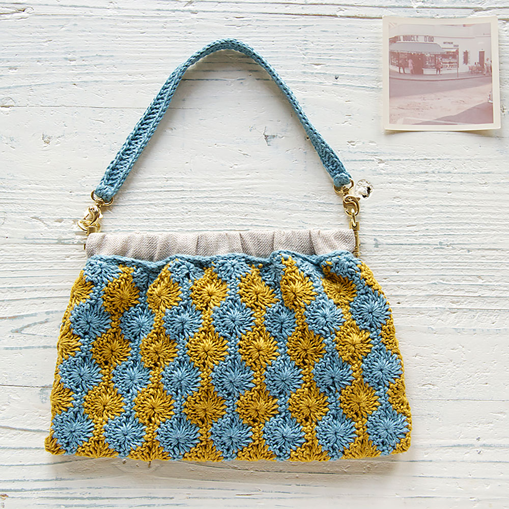 花柄の連続模様のような編み地は、ちょっぴり和のムードもあるレトロな配色で。バッグinバッグとしても重宝する持ち手つきのコンパクトなデザインです。