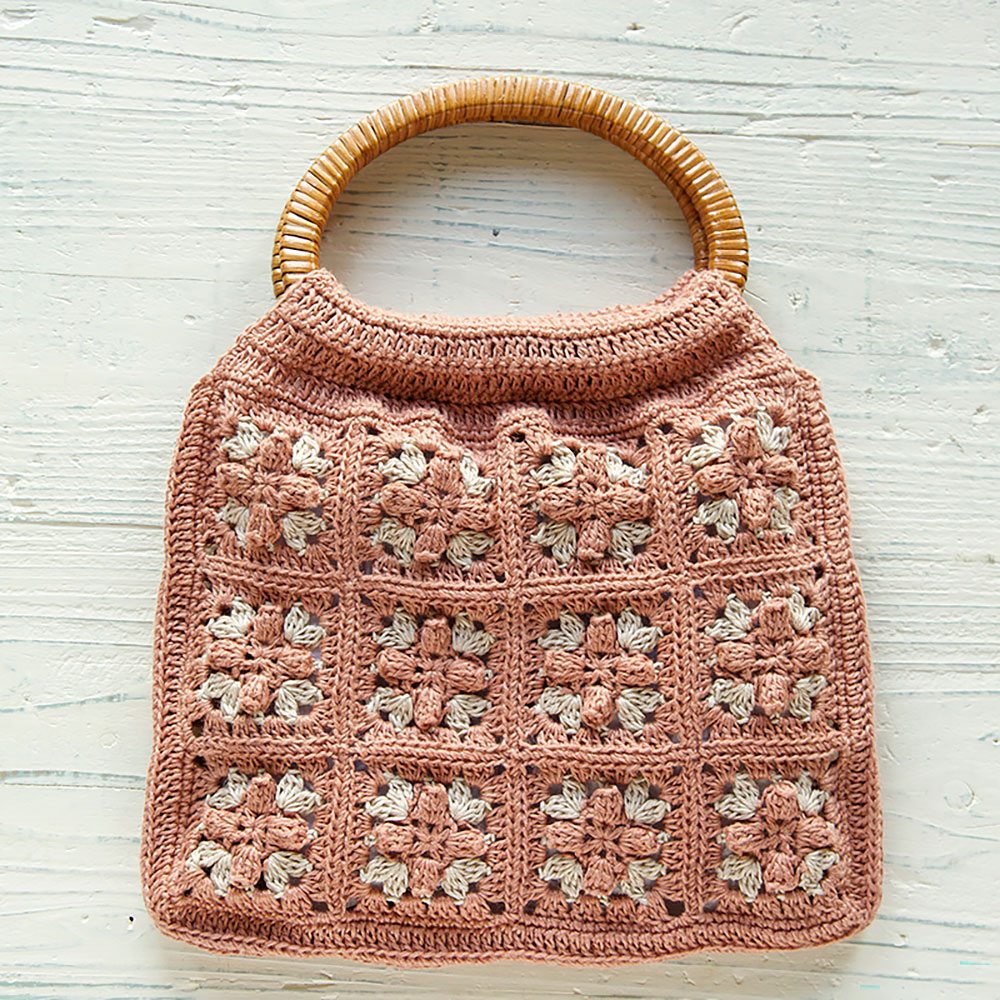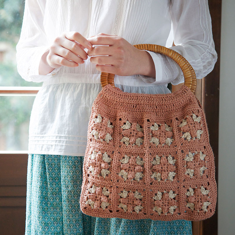 やさしいピンク×ベージュのモチーフが並ぶお花畑のような編み地です。ころんとした籐ハンドルを袋口でくるんでつければ、ナチュラルで春らしいバッグが完成。