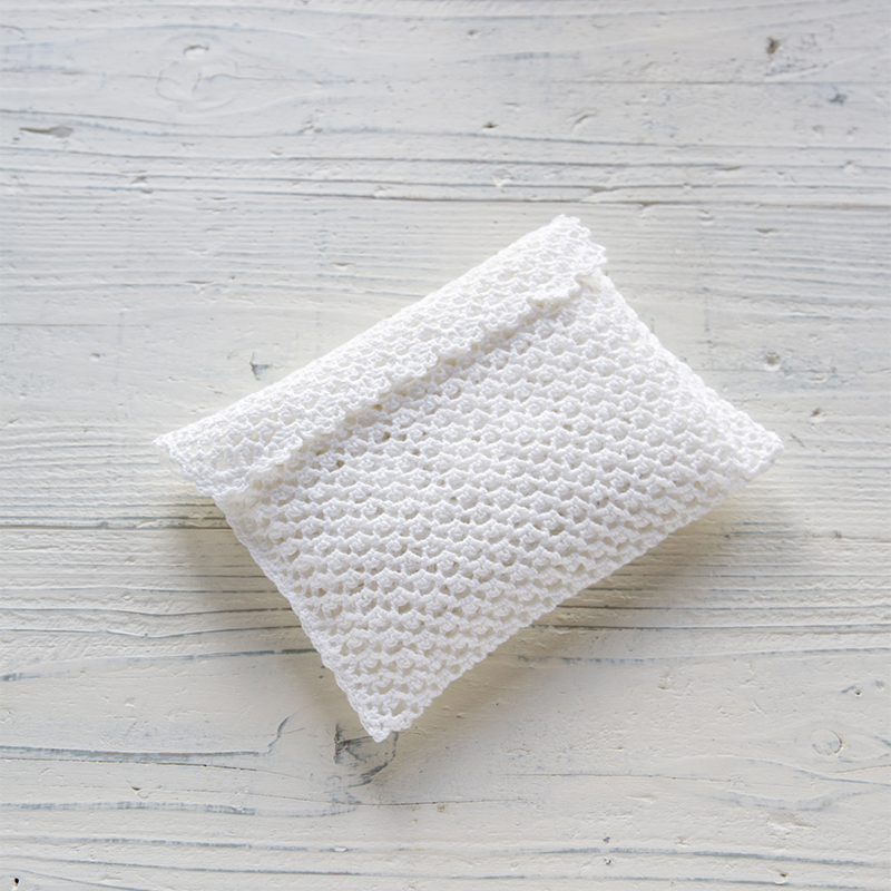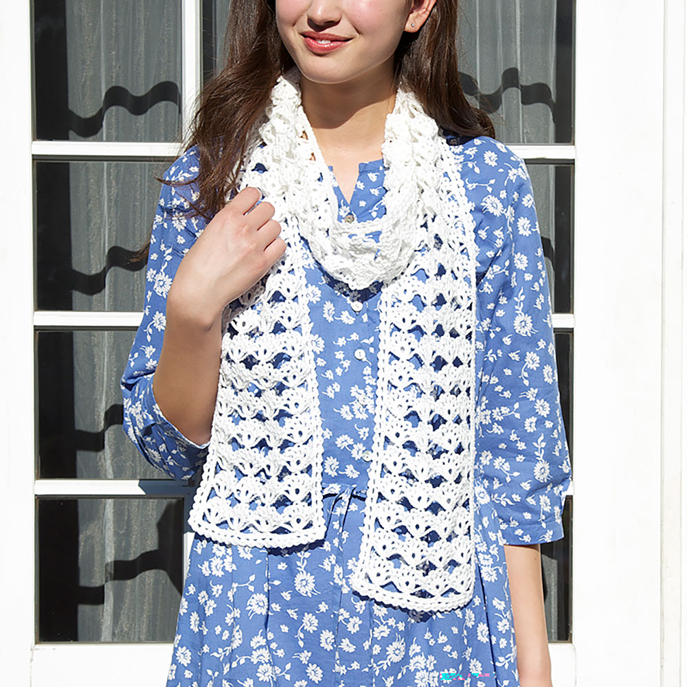 モチーフレースのような連続模様を真っ白な糸で編んだ品によいショールです。バッグに入れて持ち運べるように、収納ポーチもお揃いで編みました。