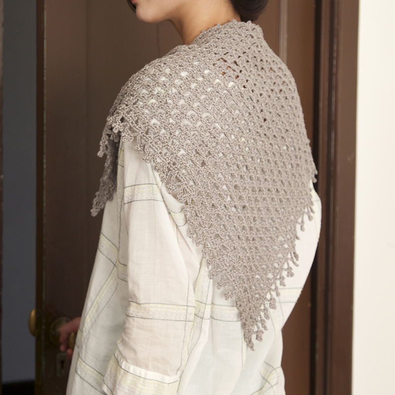 後ろ姿を自慢したくなる可憐な透かし模様のショールです。三角の頂点が編み始め。扇模様の途中にピコットを入れてニュアンスをつけました。