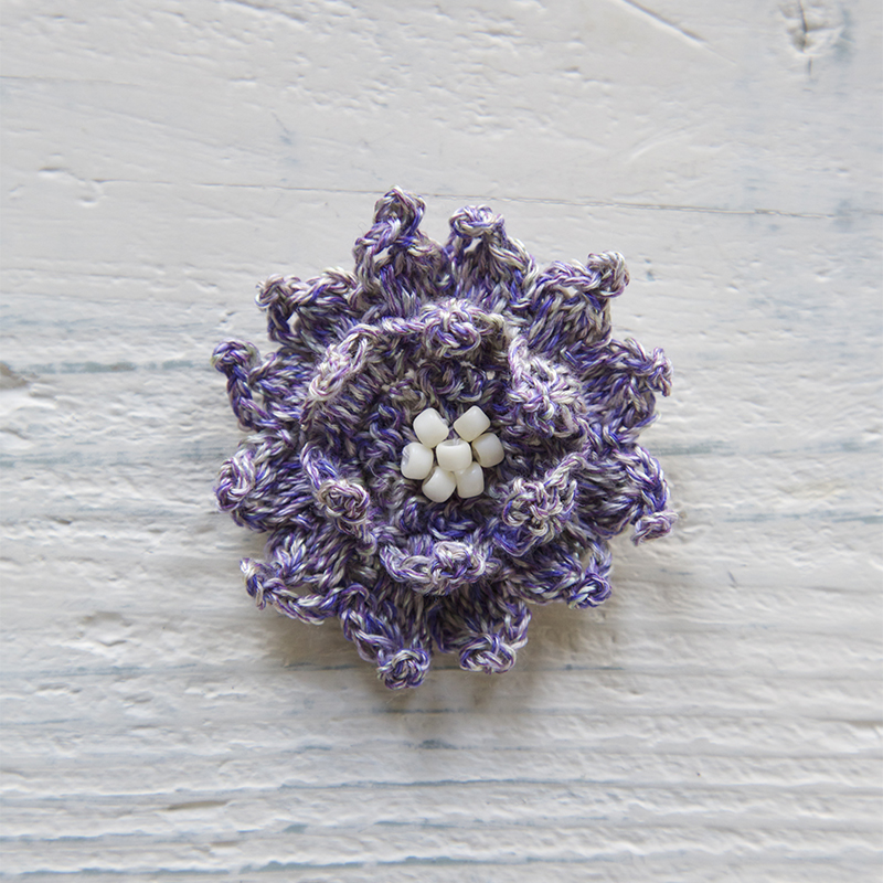 材料:スキー毛糸 スキーリーフ 紫ミックス(1206)75gビーズ7個、長さ2.5㎝のブローチピン