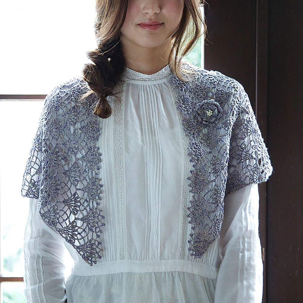 繊細な透かし編みのショールは、クラシックな装いと合わせてレディー風に。扇形の模様を両端で)増やしながら台形に仕上げます。バッグに1枚入れておくと重宝しそう。