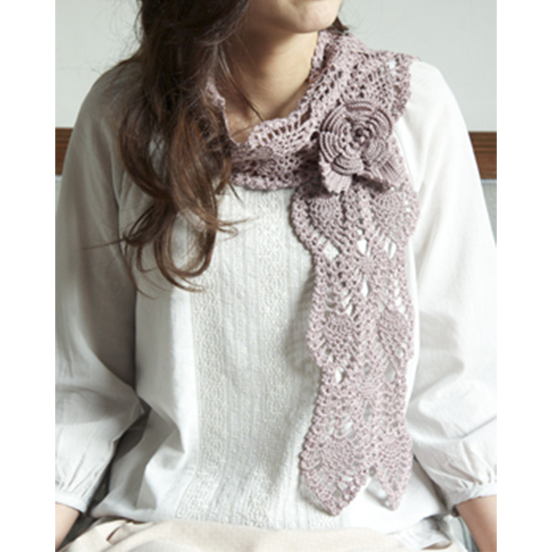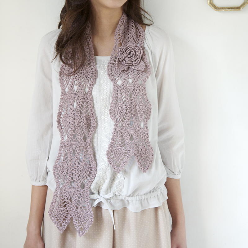 大きなパイナップル編みを2列に配した上品なデザインです。模様がきれいに見えるようにストールは細めに仕上げ、華やかな花コサージュをプラス。