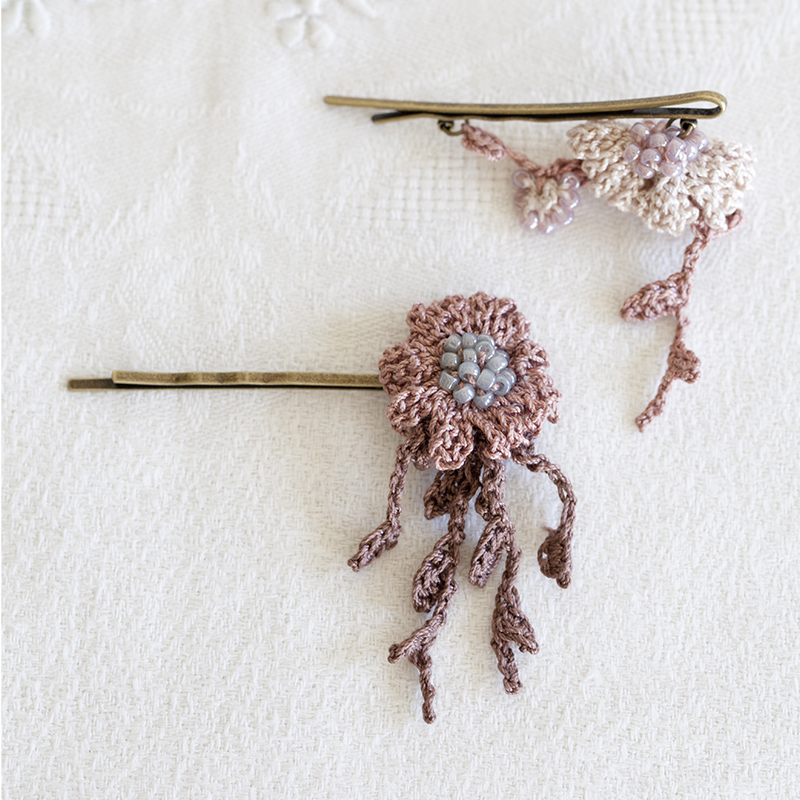 材料:[ネックレス]ダルマ レース糸#30葵 紺(20)1g、青(7)1g 、アジャスター金具1個、カニカン1個、丸カン2個、トーホー丸大ビーズ うす黄色(#148)59個[ピアス]ダルマ レース糸#30葵 紺(20)1g、青(7)1g 、U字ピアス金具1組、丸カン2個、トーホー丸大ビーズ うす黄色(#148)30個[ヘアピン]a:ダルマ レース糸#30葵 ピンクベージュ(11)1g、茶(10)1g、丸皿つきヘアピン1本、トーホー 丸大ビーズグレー(#150)15個。b:ダルマ レース糸#30葵 ベージュ(3)1g、ピンクベージュ(11)1g、カン付きヘアピン1本 丸カン2個、トーホー 丸大ビーズ ピンク(#151)22個