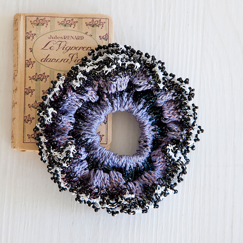 たっぷりとひだを作り、最終段にビーズを編みつけた華やかなシュシュ。全部編んだ後にゴムを通すので編みやすくてきれいに仕上がります。