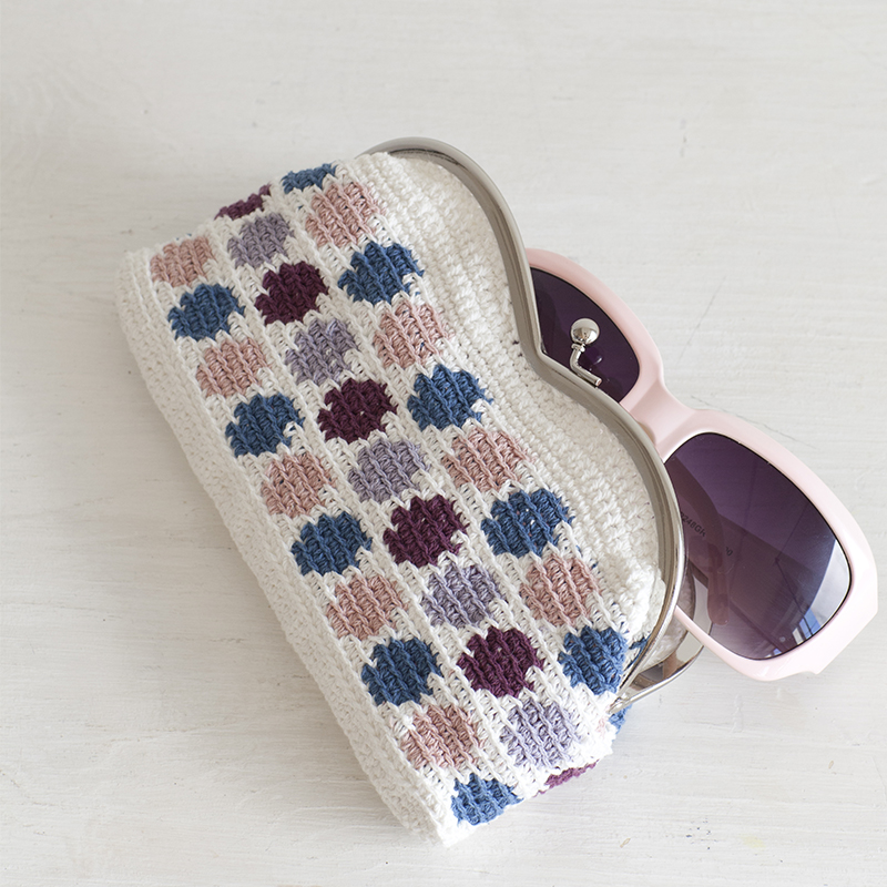 材料:ウィスター 洗えるコットン 白(1)40g ピンク(7)・青(8)各10g、薄紫(4)・赤紫(6)各5g、口金(メガネ型)S18㎝×6㎝1個
