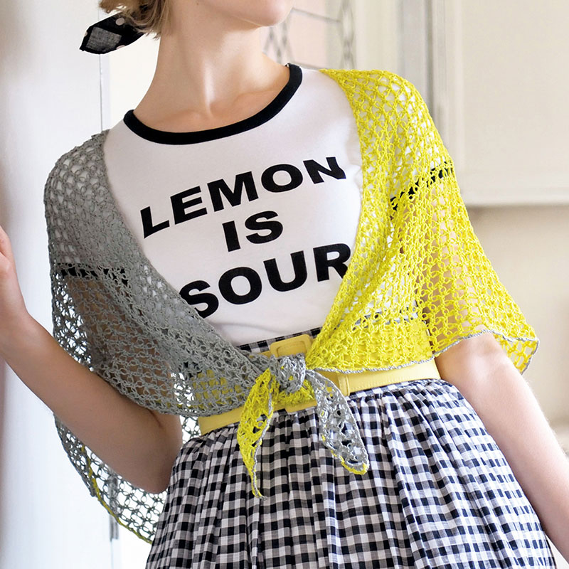 バイカラーの三角ショールは、巻き方でずいぶん印象が変わりそう。七宝編みには糸の質感がとっても重要。リリヤーンタイプのテープヤーンなら、糸の面白さも堪能できます。