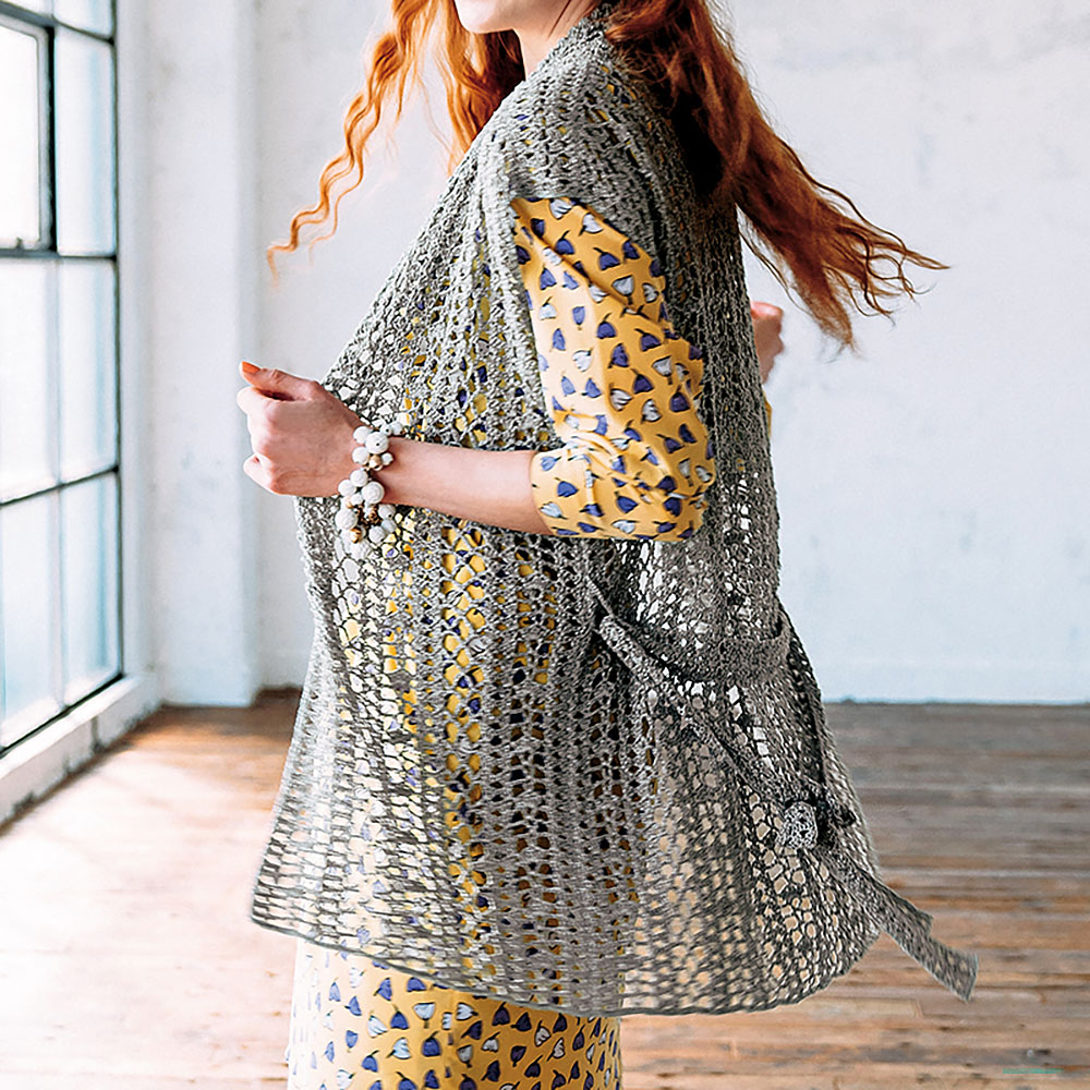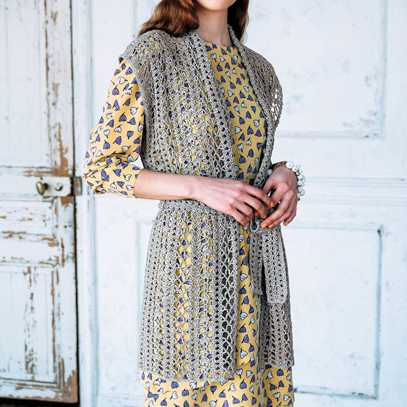 お揃いのベルトで絞って着ても、羽織るだけでも絵になるかぎ針編みのジレ。エレガントな服ともTシャツ&ジーンズとも上手に合わせられる、お役立ちアイテムです。かぎ針編みのウエアは、機械では編めない手仕事のワザ。ラメ糸で編めば、最高のアクセサリーになります。