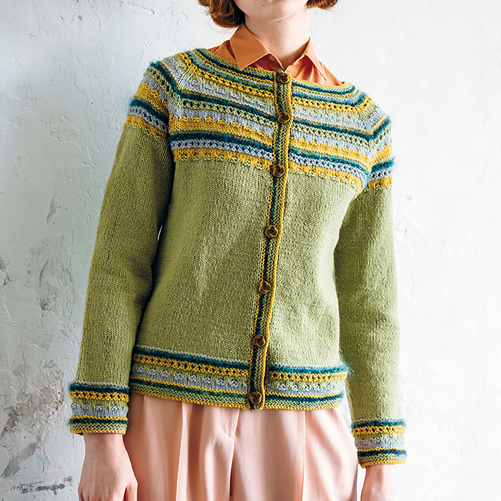 寒さがゆるんだ途端、大地の色は新しい命にあふれ、様変わりします。配色部分にリズミカルに現れる毛足の長い糸のくるくるしたループに癒される、春色カラーのカーディガンです。