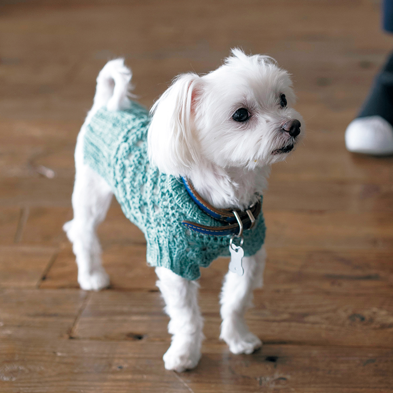白い毛並みに爽やかなグリーンがぴったり! 肌触りのよいサマーヤーンで編む、わんこ用のかぎ針編みベスト。モデルはお散歩が大好きなマルチーズのコロちゃん、小型犬です。衿と袖口は棒針で2目ゴム編みにして、後ろ衿にはリード穴を作ります。わんこにうれしい着やすい工夫がいっぱい。