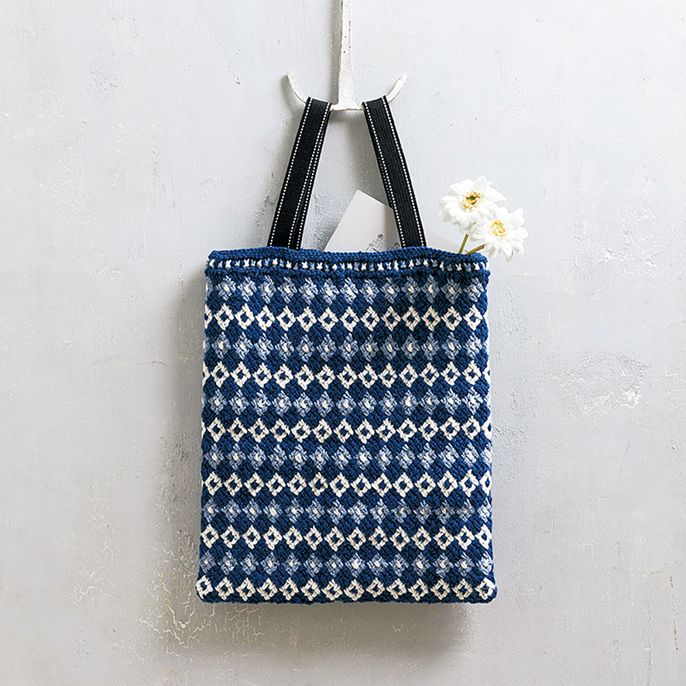 ブルー系でまとめた編み込み柄はなんだか和のイメージ。編み方は難しくはありませんが、実際に現れる柄と編む糸の色がずれる点に気をつけて編んでください。布の内袋をつけて仕立てると、さらにしっかりして使いやすいバッグになります。