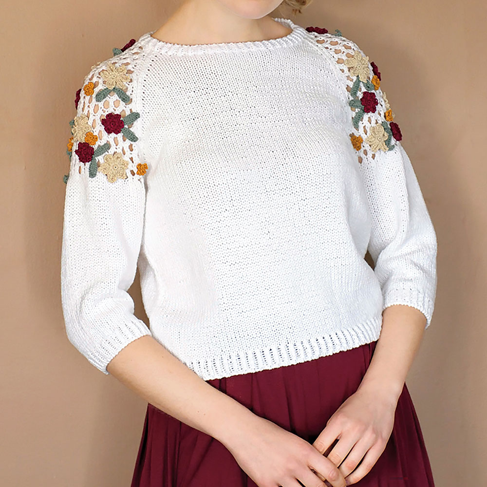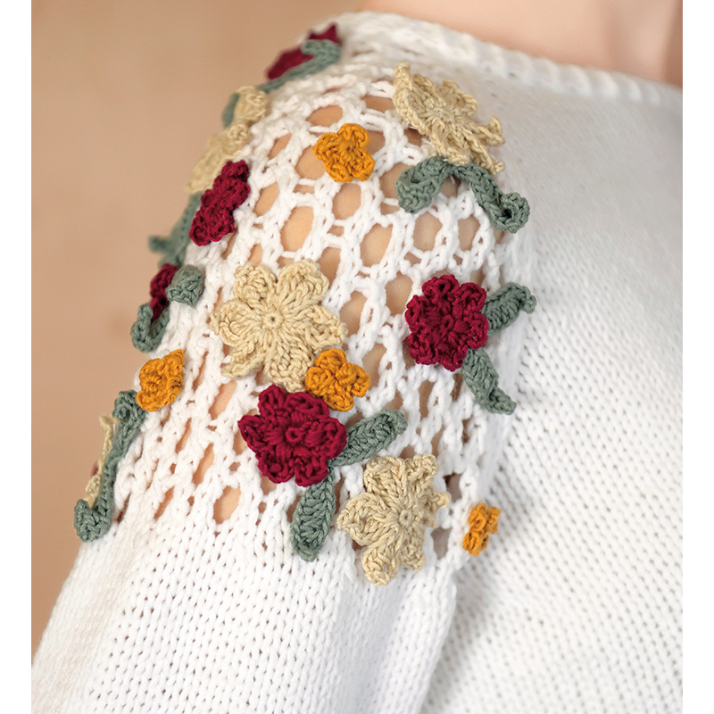 シンプルなメリヤス編みの身頃とさりげない肌見せの袖はラグラン切り替えで。肩に小さな花モチーフをたくさんあしらって可憐に。