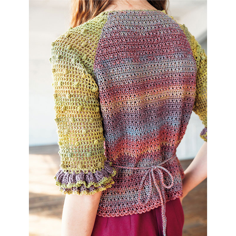 丸ヨークのカーブに添って揺れるフリルの重なりは、手編みならではの醍醐味。このフリル、なんと五つ巻き長編みを編みつけています。たっぷりとしたフリルを身につけると心躍るのは、何歳になっても変わらない乙女心。袖だけに配したパプコーンも可愛らしく、幸せな気持ちで編み進むことができます。