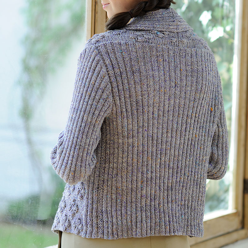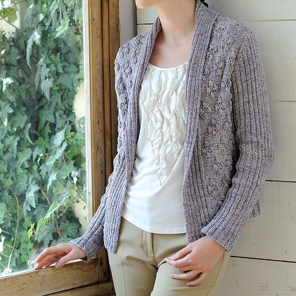 タキシードカラーのカーディガン・ジャケットは前身頃から後ろヨークへと続けた模様編みボッブルが効果的。春先にぴったりな一着です。