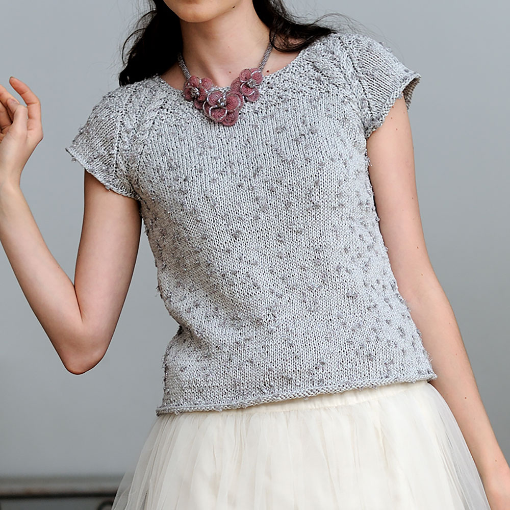 キラ光るファンシーヤーンをプラスしてエレガントな香りが漂うプルオーバー。ラグラン切り替えのプチスリーブが可憐な表情です。