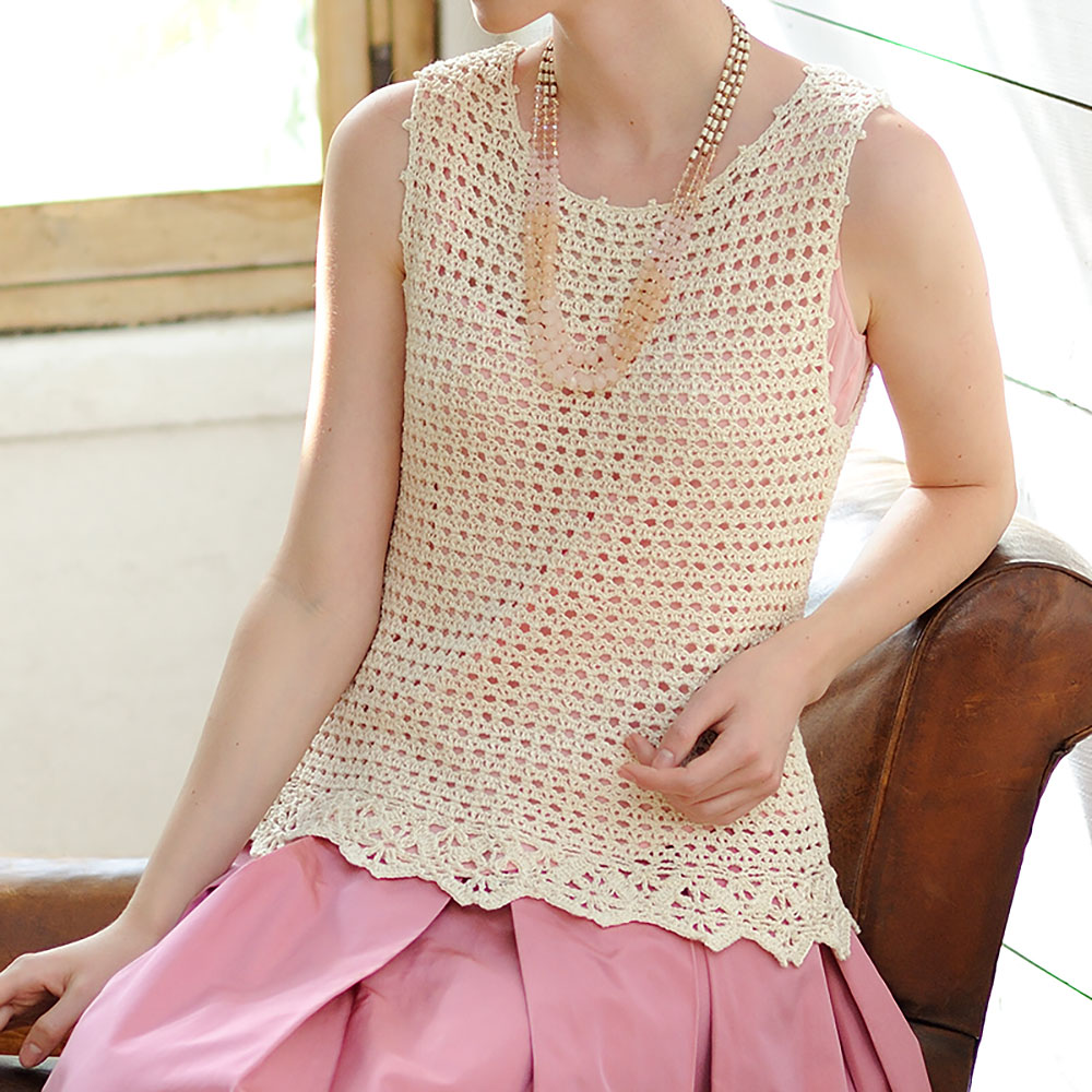 上品な雰囲気が漂う、かぎ針編みのノースリーブプルオーバー。シンプルな編み地に袖のスカラップ飾りが映えるお洒落なフォルムです。