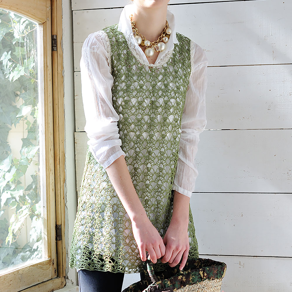 透け感のある繊細な編み地のチュニックは、裾の向かってふんわり広がるAラインシルエット。衿ぐり、袖ぐりのホワイトの縁編みが可憐です。