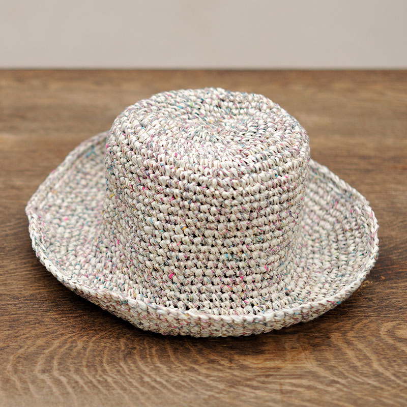 ツイード調ヤーンと和紙ヤーンを引き揃え編みにした帽子は、トップからブリムへ細編みでぐるぐる編みます。