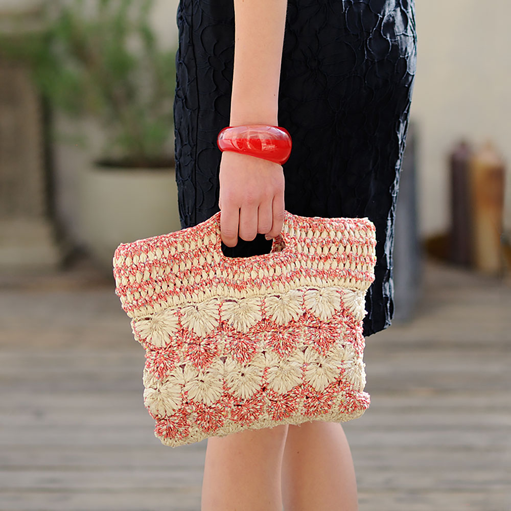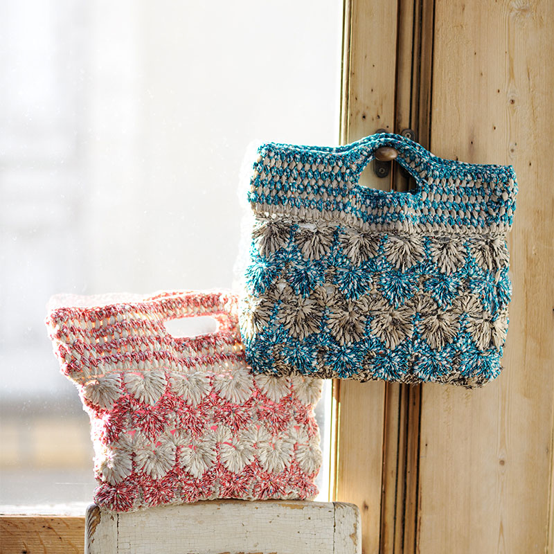 材料:[ピンク系パピー カルナバル(極太タイプ) ピンク系(804)70g=2玉、リーフィー(合太タイプ) 生成り(751)40g=1玉、ミロワール<フルール>(中細タイプ) 生成り×金(503)15g=1玉[グリーン系]パピー カルナバル(極太タイプ) グリーン系(805)70g=2玉、リーフィー(合太タイプ) ベージュ(752)40g=1玉、ミロワール<フルール>(中細タイプ) こげ茶×金(505)15g=1玉