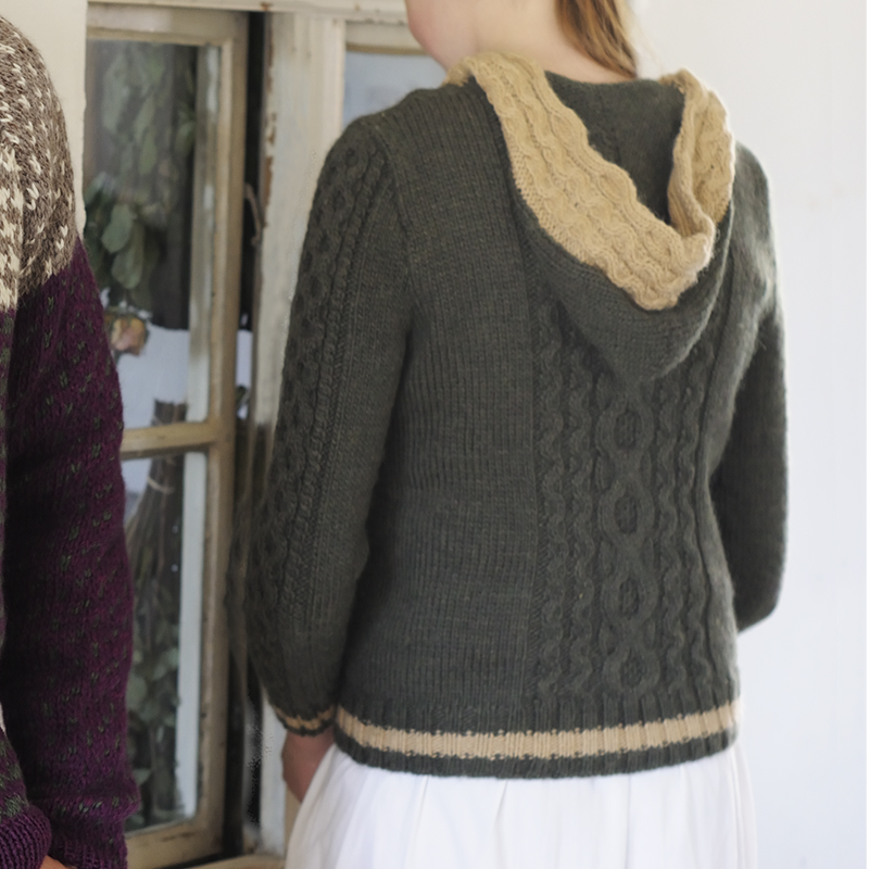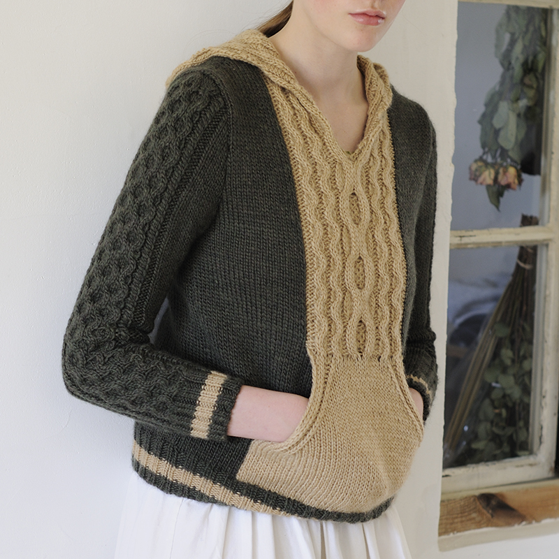 誰もが1枚は持っているフード付きパーカーを毛糸で編んだらこうなりました。ニットバージョンらしい、アラン模様と前身頃の切り替えのバランスがいい感じ!身頃からフードへと続く縄編みの、編みっぱなしの編み端のラフ感も可愛らしくアクセント。