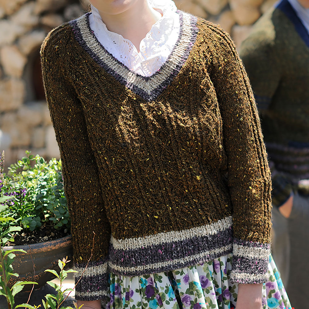 ボッブルつきのダイヤ柄入りのデザインと、深みのあるカラーリング&ツイードヤーンで、おしゃれに生まれ変わったチルデン・セーター。V衿のシルエットは好きなのに、生成りのトリコロールカラーの配色は元気すぎてちょっと苦手…な人にもお勧めです。