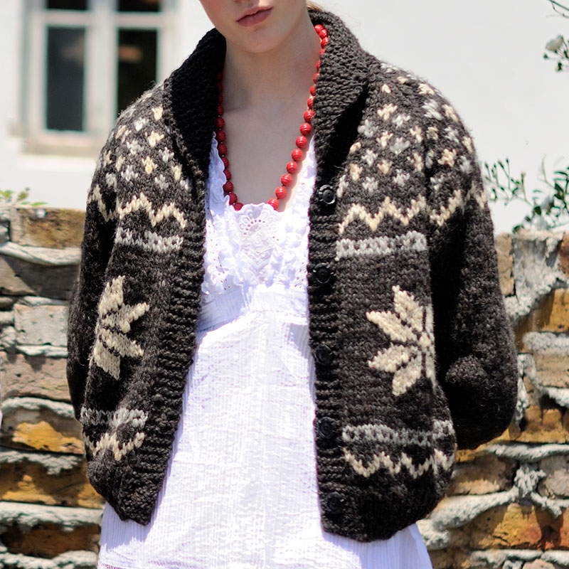 カウチンスタイルのニットジャケットは、輝く星のモチーフを配して。エイトスターは、ニットのみならず、様々なもののモチーフとして使われている、伝統柄のオールラウンドプレイヤー。どんな色で編んでも、女の子にも男の子にも似合うのも、トップスターならではの偉業です。
