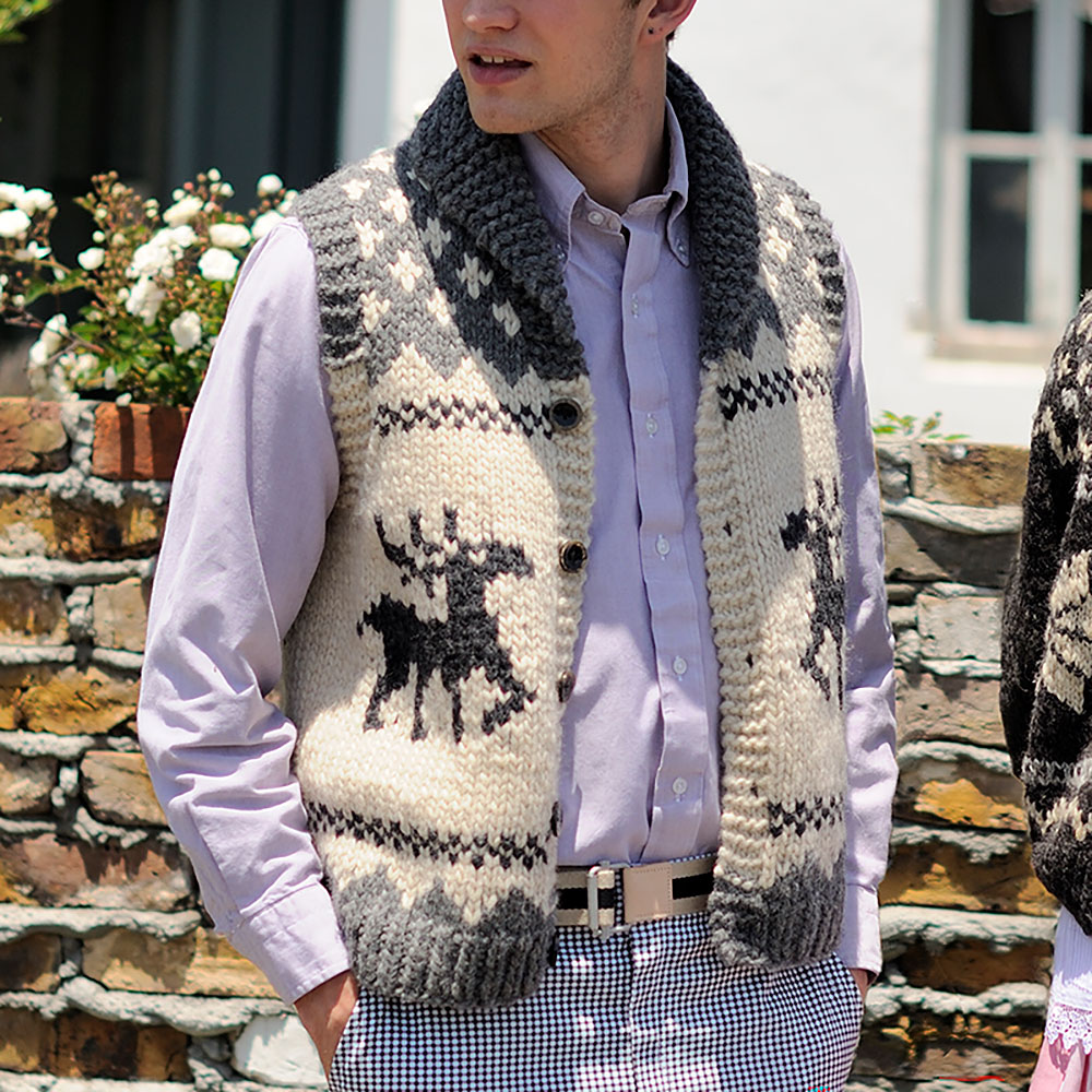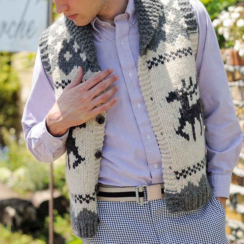 その雄々しい姿から「森の王」と呼ばれているヘラジカ。可愛らしいモチーフとして編み込まれていますが、意匠としての優美さは王者の風格です。あっという間に編みあがり、部厚くて暖かいカウチンベストは、やんちゃで活動的な彼にぴったり。プレゼントにどうぞ。